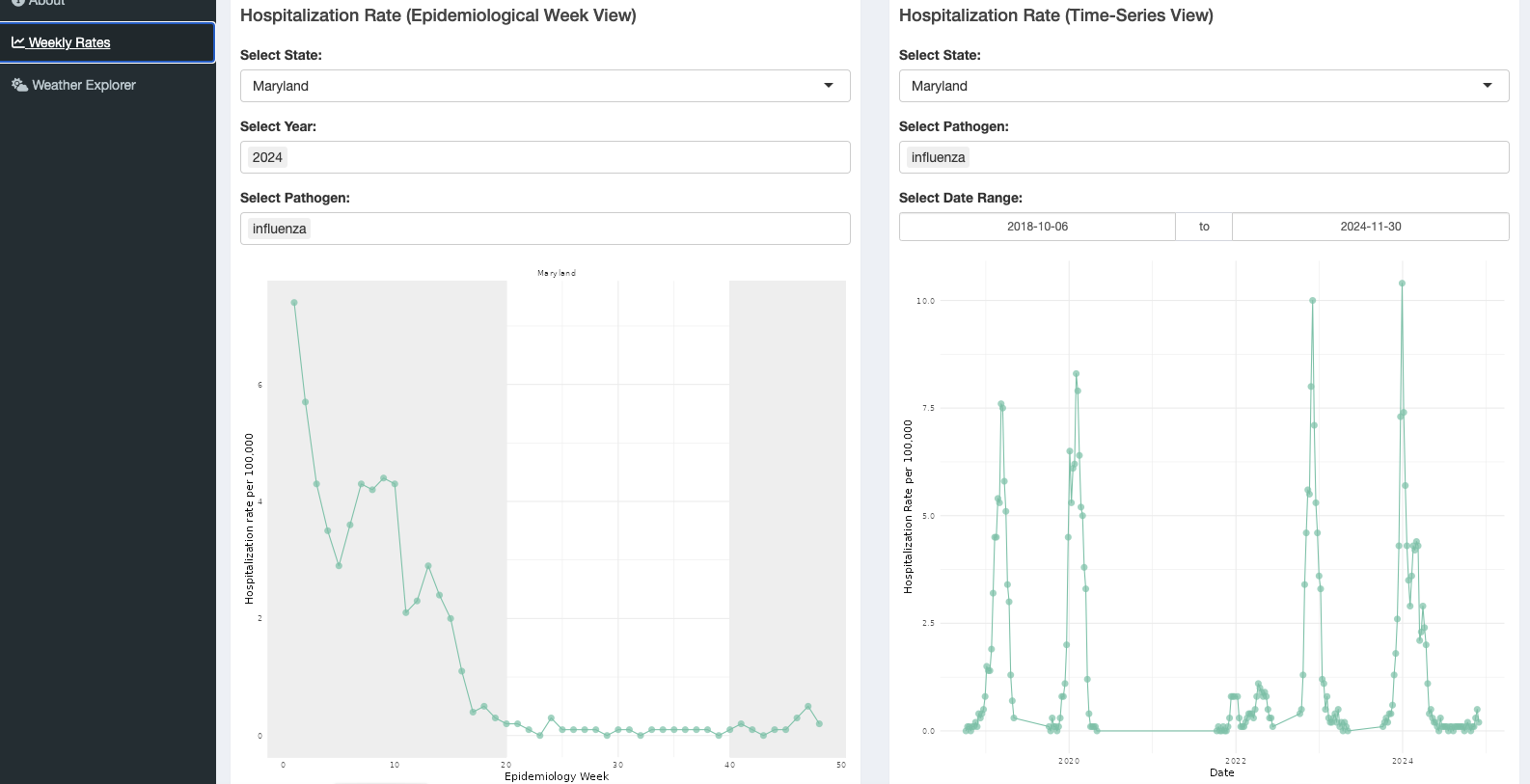 - Weather Explorer: This dashboard integrates environmental parameter data from openmeteo API and respiratory virus-associated hospitalization rate data to perform regression analysis. The user can select year, state, weather variable and pathogen of interest using the interactive filters.